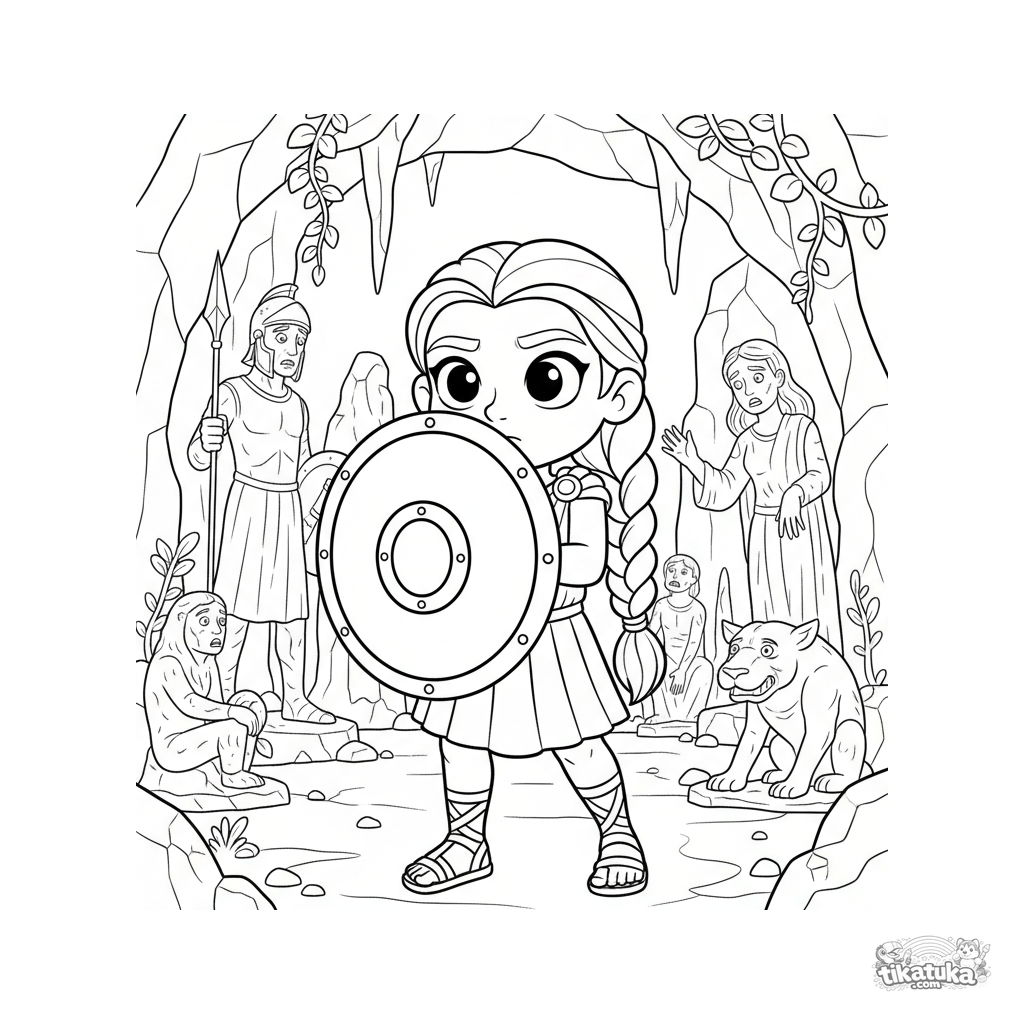 Ausmalbild: Eine junge Heldin in Medusas Gorgenhöhle zwischen Steinstatuen. Für Kinder von 7-9 Jahren.