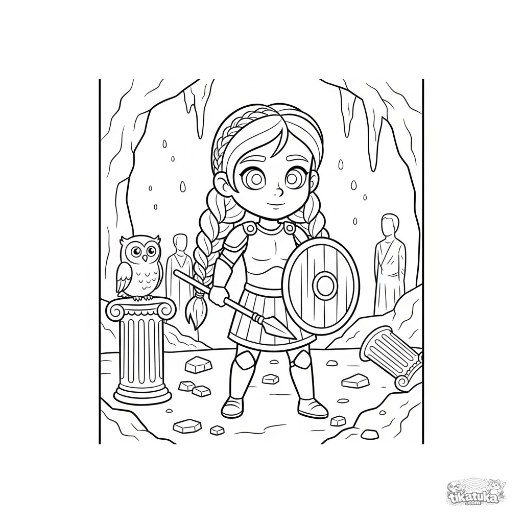 Ausmalbild für Kinder 7-9: Eine junge Kriegerin in der Gorgonenhöhle. Szene mit einer Eule und Steinbrocken.
