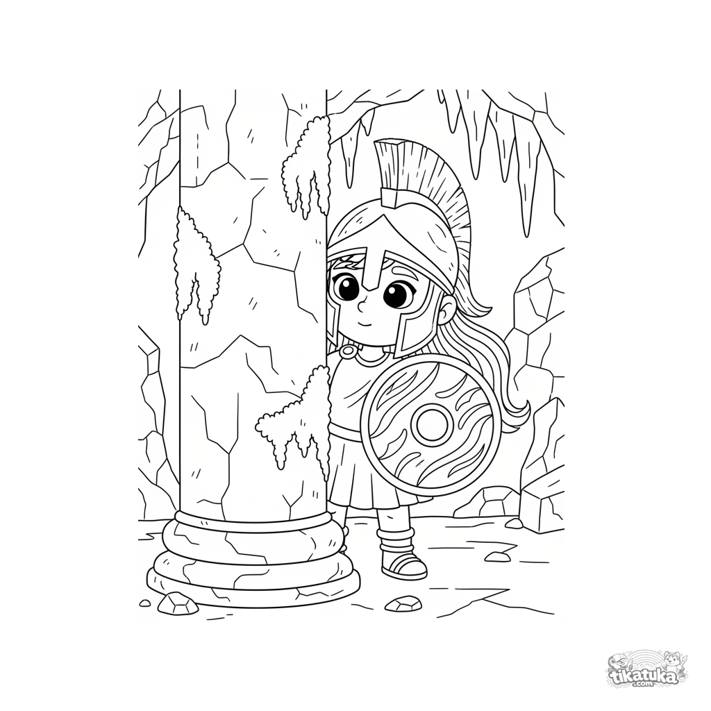 Ausmalbild für Kinder 7-9: Junge Kriegerin Athene lugt vorsichtig hinter einer Säule in der steinernen Gorgonenhöhle hervor. Eine Szene aus der griechischen Mythologie mit Schild und antiken Mustern.