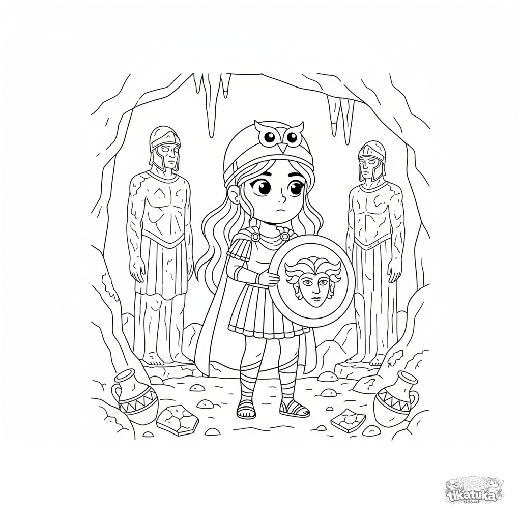 Ausmalbild: Eine junge Kriegerin in der Gorgonenhöhle. Für Kinder von 7-9 Jahren. Szene der Erkundung einer Höhle mit versteinerten Statuen.