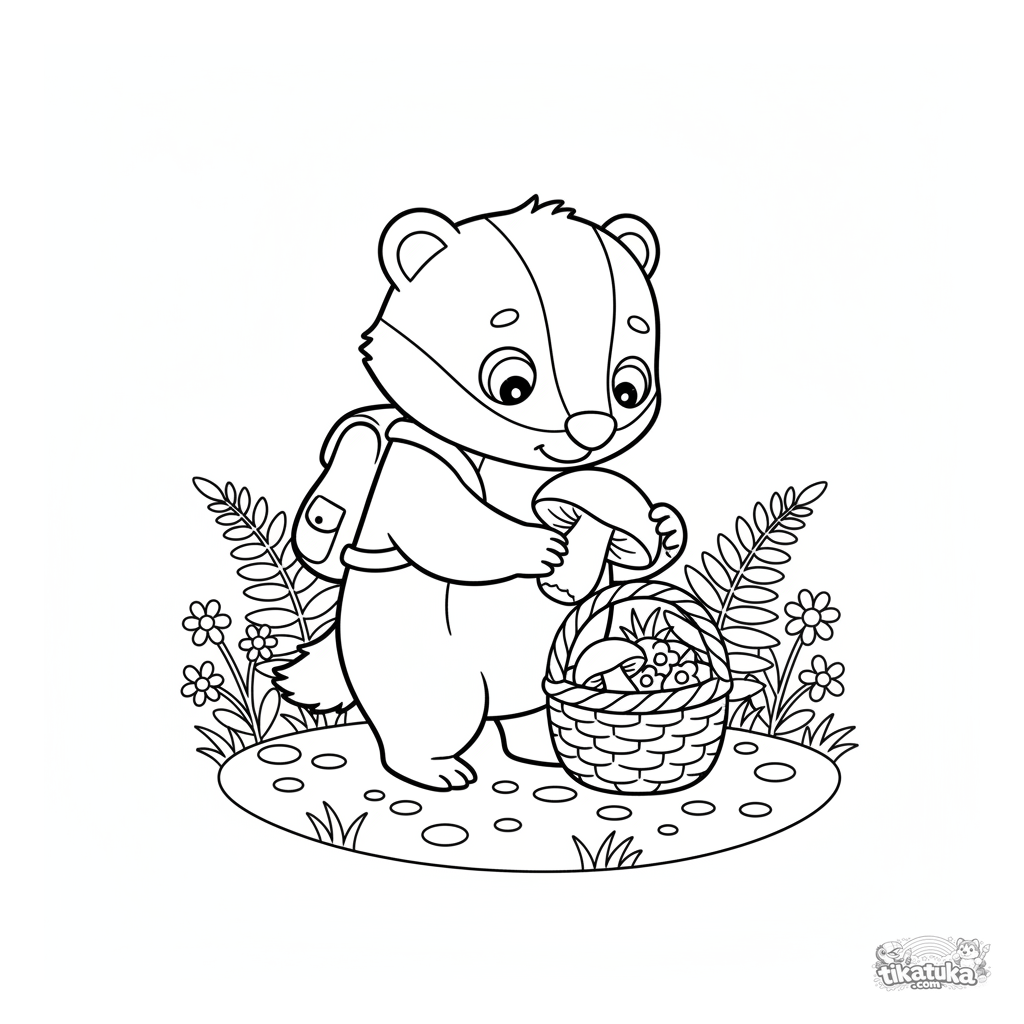 Ausmalbild für Kinder 4-6: ein junger Dachs sammelt mit einem Korb Pilze am sonnigen Waldrand. Klare Linien, erkennbare Figur, gut für Feinmotorik.