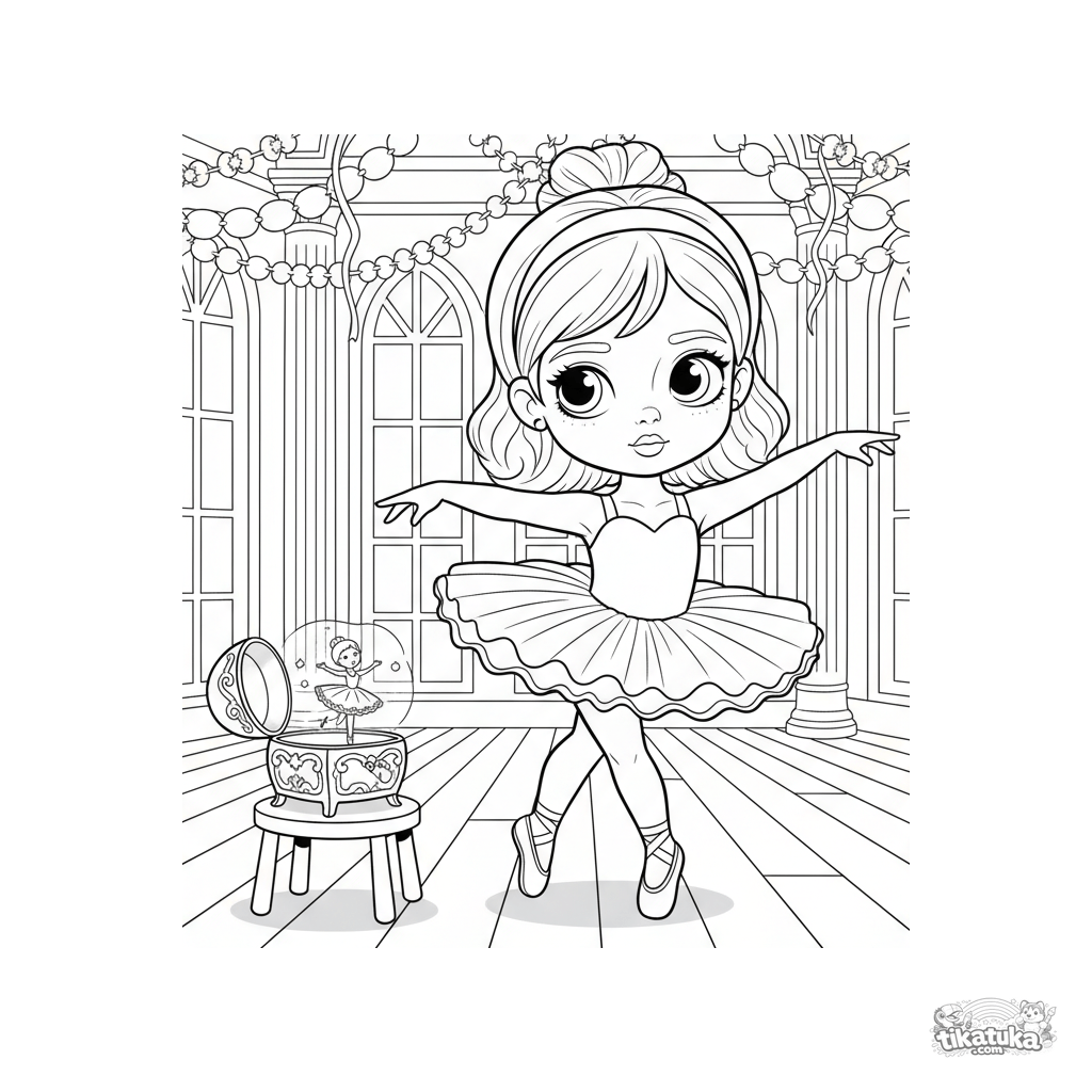 Ausmalbild für Kinder 4-6: Eine junge Ballerina im flauschigen Tutü übt eine Pirouette in einem dekorierten festlichen Saal. Einfache klare Umrisse, niedlicher Gesichtsausdruck.