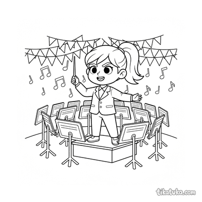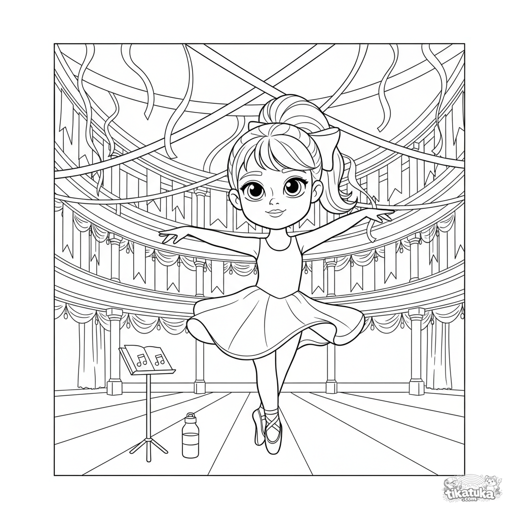 Ausmalbild für Kinder 7-9: Eine junge Ballroom-Tänzerin übt Pirouetten in einem dekorierten Festraum.