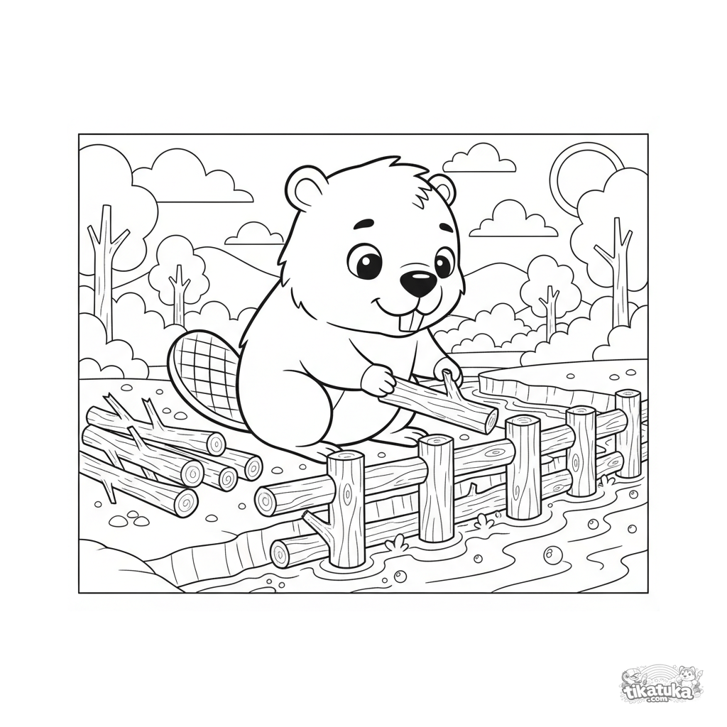 Ausmalbild für Kinder 4-6: Ein junger Biber baut einen Damm am Ufer eines klaren Baches. Süße Szene aus dem Tierleben.
