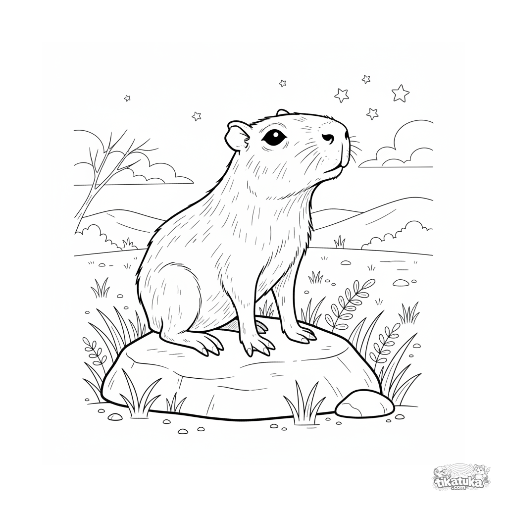 Ausmalbild für Kinder 4-6 im realistischen Stil: Ein junges Capybara sitzt auf einem Felsen im Feld und beobachtet staunend Sonnenuntergang und erste Sterne.