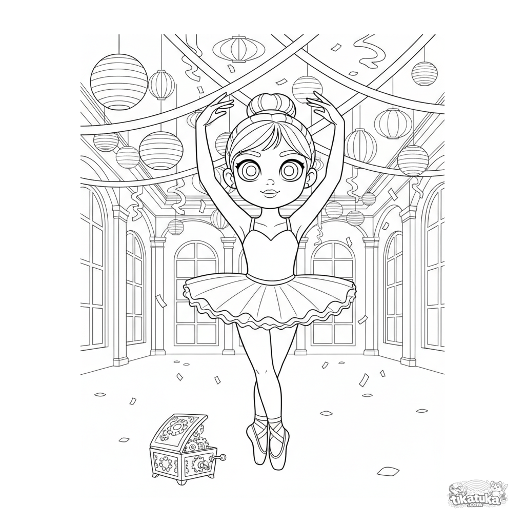 Ausmalbild für Kinder 7-9: Eine junge Ballerina übt in einer dekorierten Festhalle. Vollkörper sichtbar mit breiten weißen Rändern.