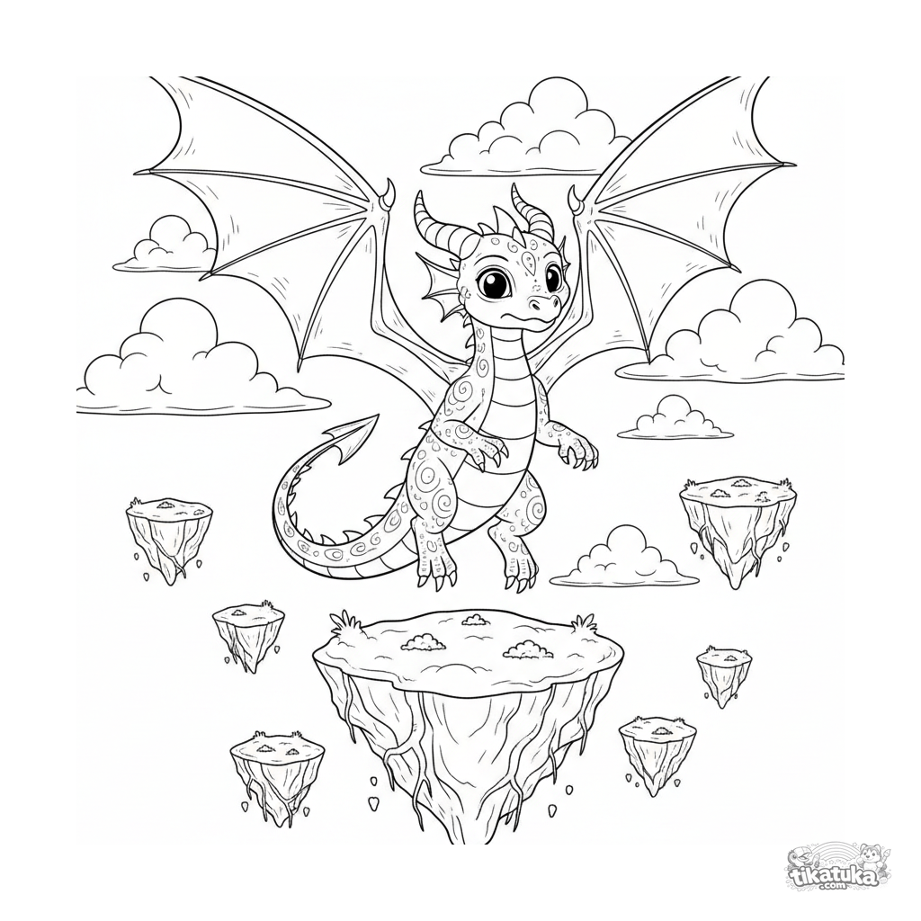 Ausmalbild für ältere Kinder 10-12: Ein junger Drache mit übergroßen Flügeln lernt das Fliegen über moosbedeckten schwebenden Inseln. Detaillierte Fantasieszene.