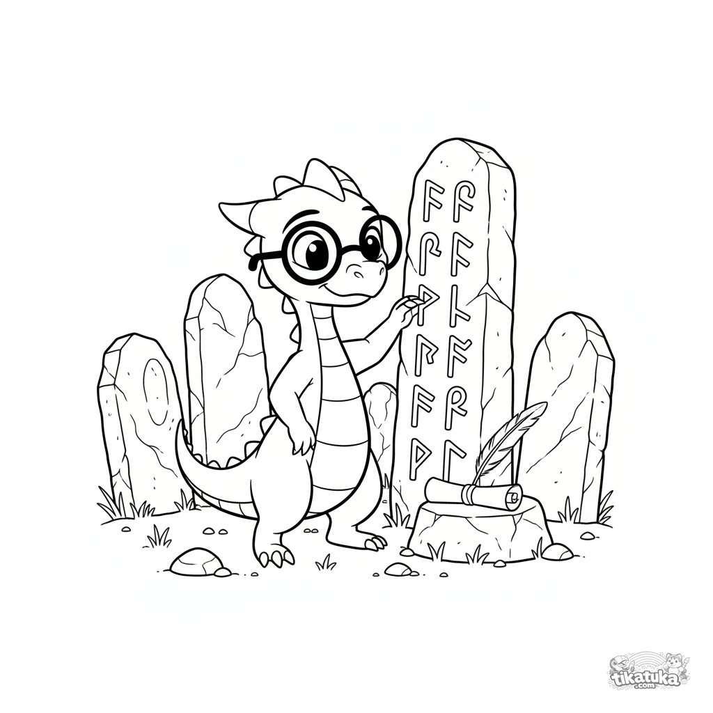 Ausmalbild für Tweens 7-9: Ein junger, gelehrter Drache mit Brille studiert aufmerksam alte Runen auf Monolithen. Ausdrucksstarke Pose, mäßiges Detail, Hintergrund mit Steinen.