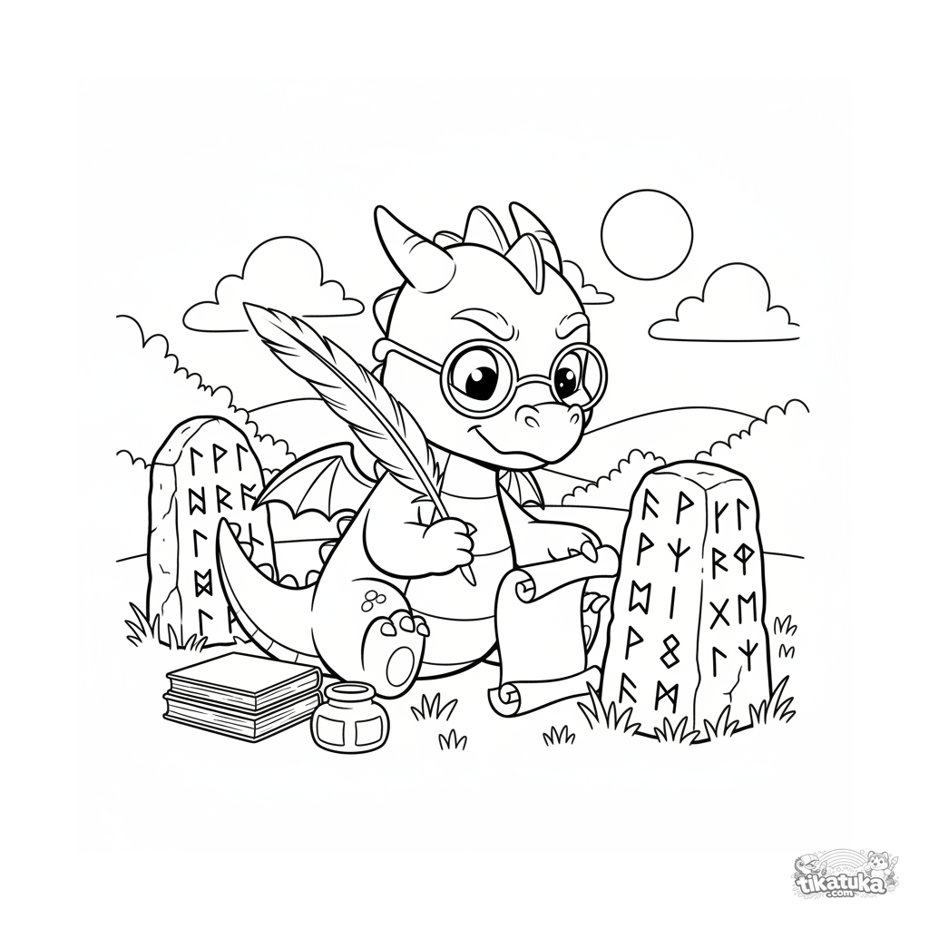 Ausmalbild für Kinder 7-9: Ein junger gelehrter Drache mit Brille kopiert fleißig alte Runen von einem Monolithen auf eine Schriftrolle. Szene mit historischer Stimmung.