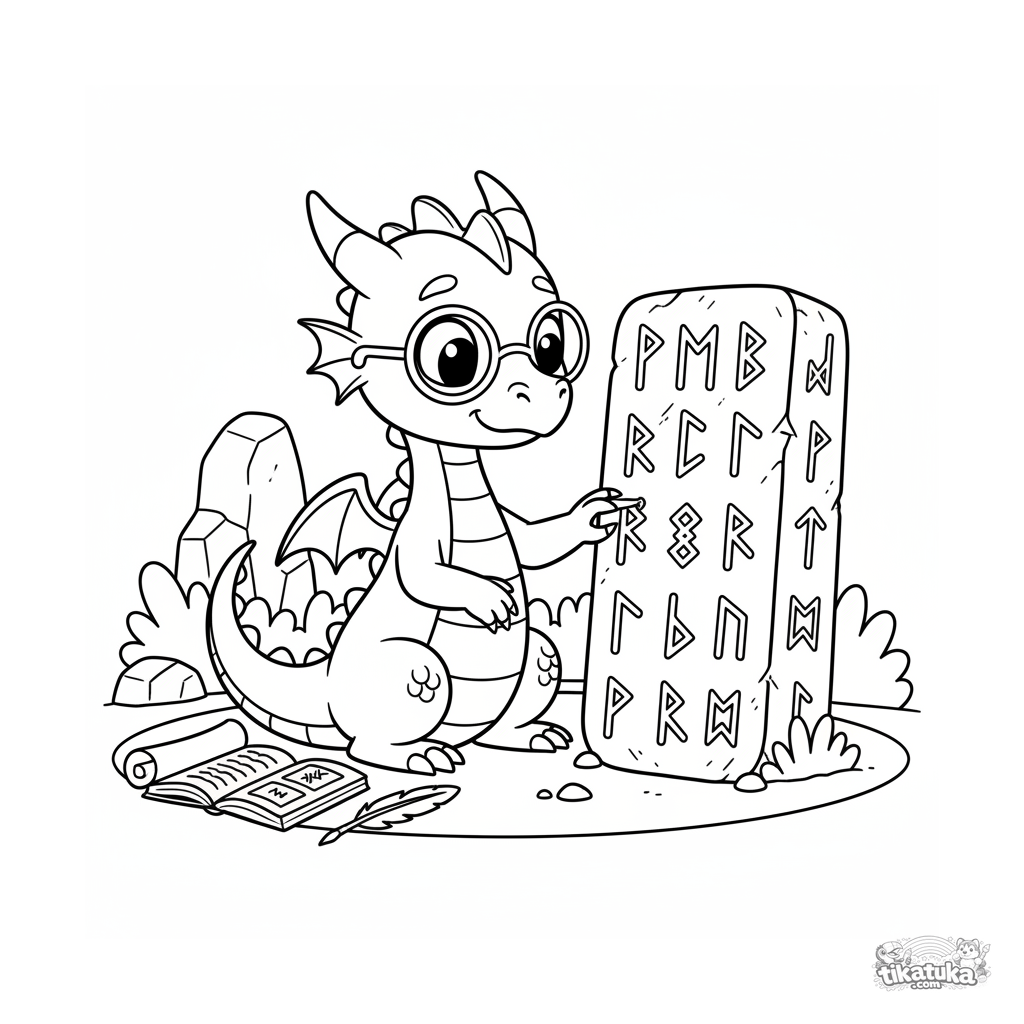 Ausmalbild für Tweens 7-9: Ein junger Drache mit Brille studiert aufmerksam Runen auf einem alten Monolithen. Eine Schriftrolle und eine Feder in der Nähe, detaillierte Szene zum Ausmalen.