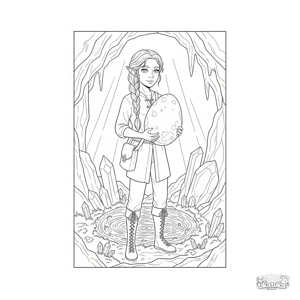 Ausmalbild für 10-12 Jahre: Ein junger Elf entdeckt ein leuchtendes Drachenei in einer Kristallhöhle. Detaillierte Szene zum kreativen Ausmalen.