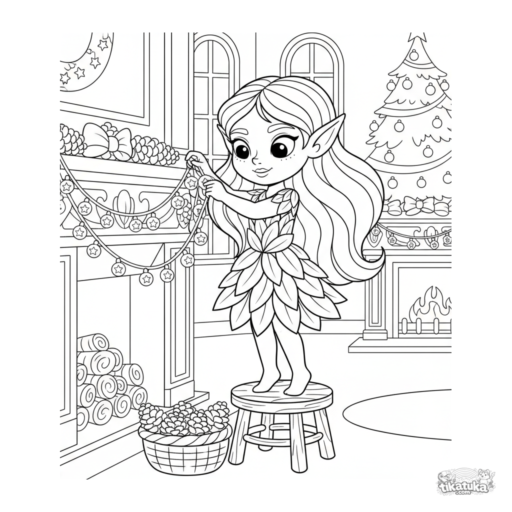Ausmalbild für Mädchen: Ein Elfenmädchen richtet Lichterketten in einem dekorierten Festraum aus. Szene für Kinder von 7-9 Jahren.