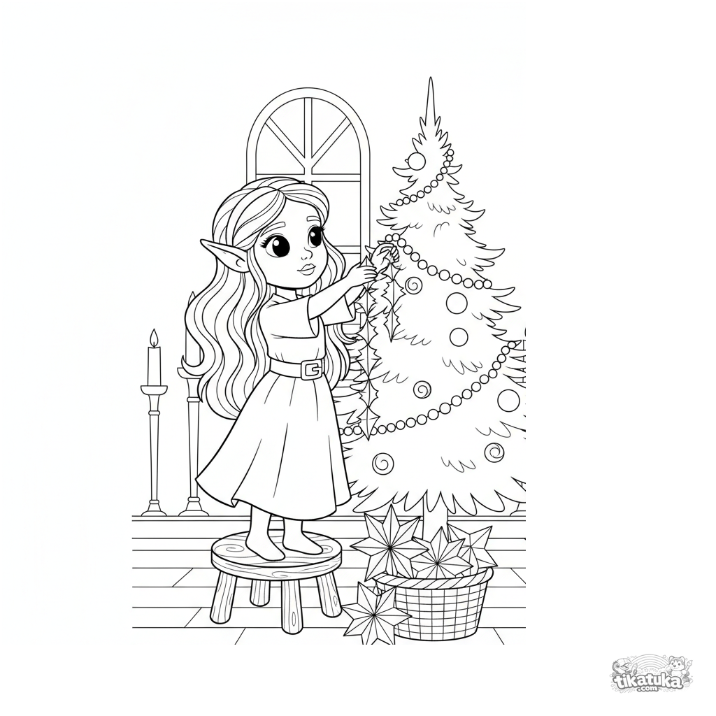 Ausmalbild für Kinder 4-6: Ein Elfenmädchen schmückt einen Festbaum mit Papierketten in einer dekorierten Halle. Niedliche Szene für Kreativität.