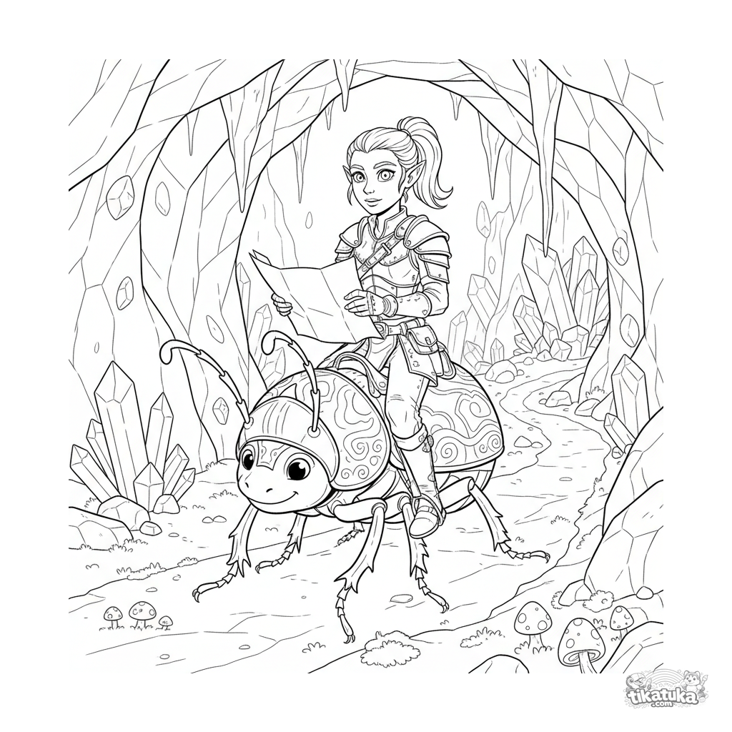 Ausmalbild für 10-12 Jahre: Ein Elf-Pfadfinder reitet auf einem Riesenkäfer durch eine leuchtende Kristallhöhle. Detaillierte Szene für Fantasy- und Abenteuerfans.