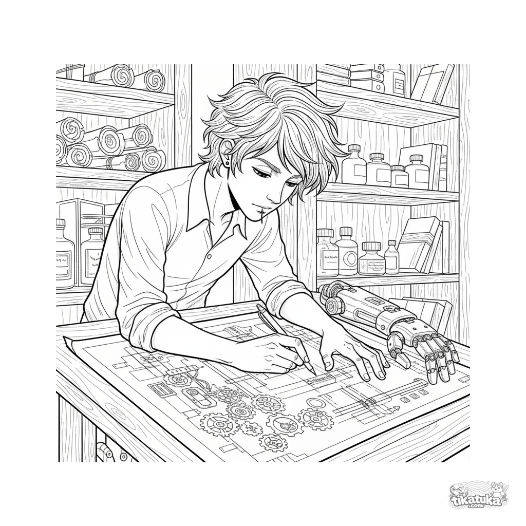 Detailliertes Ausmalbild für 10-12 Jahre: Ein junger Ingenieur in einem geheimen Labor zeichnet einen komplexen Automaten-Plan.