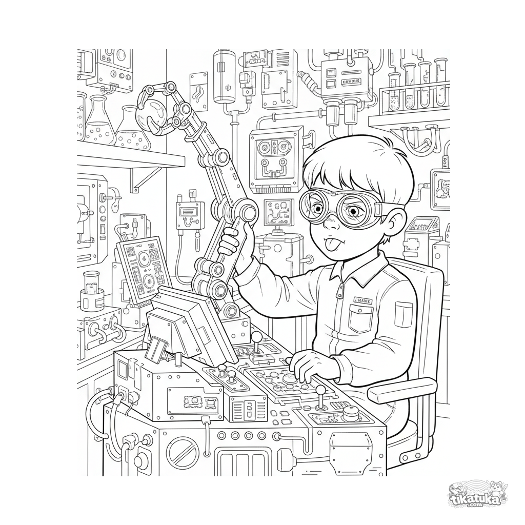 Komplexes Ausmalbild für Kinder 10-12: Ein junger Ingenieur bedient im Labor einen Teleskop-Greifer.