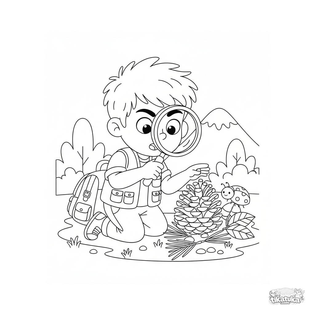 Ausmalbild für Jungen 4-6: ein junger Forscher im Wald untersucht einen Tannenzapfen mit einer Lupe. Eine Szene, die Neugier fördert.