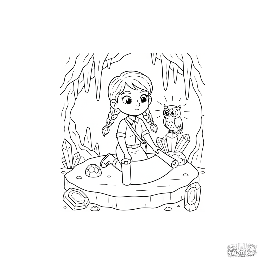 Ausmalbild eines jungen Forschermädchens, das eine funkelnde Kristallhöhle mit ihrer Eule kartiert. Für Kinder von 4-6 Jahren, fördert Neugier.