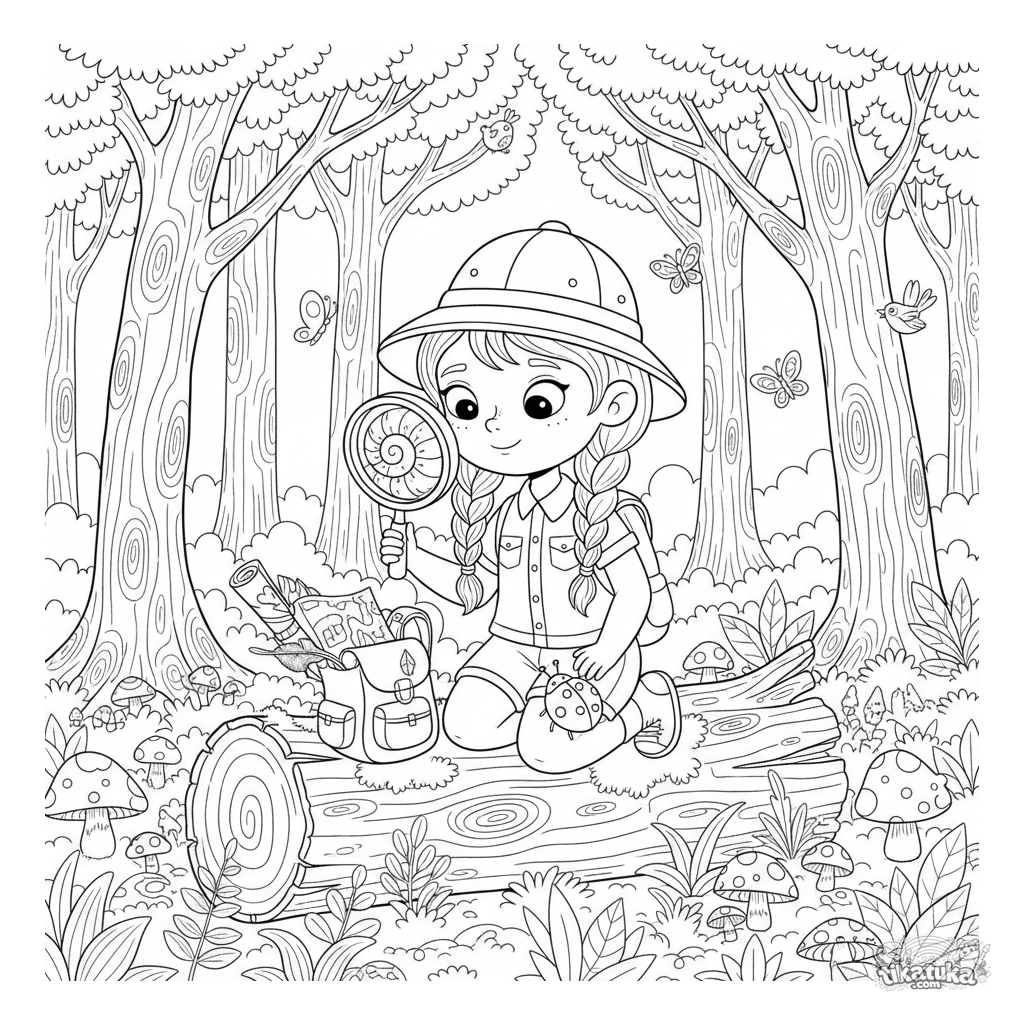 Ausmalbild für Mädchen: Eine junge Forscherin untersucht ein Schneckenhaus mit einer Lupe in einem verzauberten Wald. Für Kinder von 6-9 Jahren. Viele interessante Details zum Ausmalen.