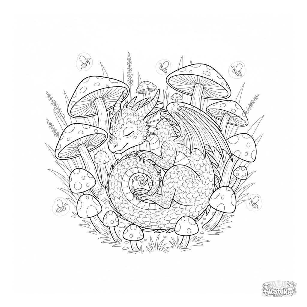Ausmalbild für Kinder 4-6: ein kleiner Walddrache mit gefiederten Flügeln schläft friedlich auf einem Kreis riesiger Fliegenpilze in einer magischen Lichtung.