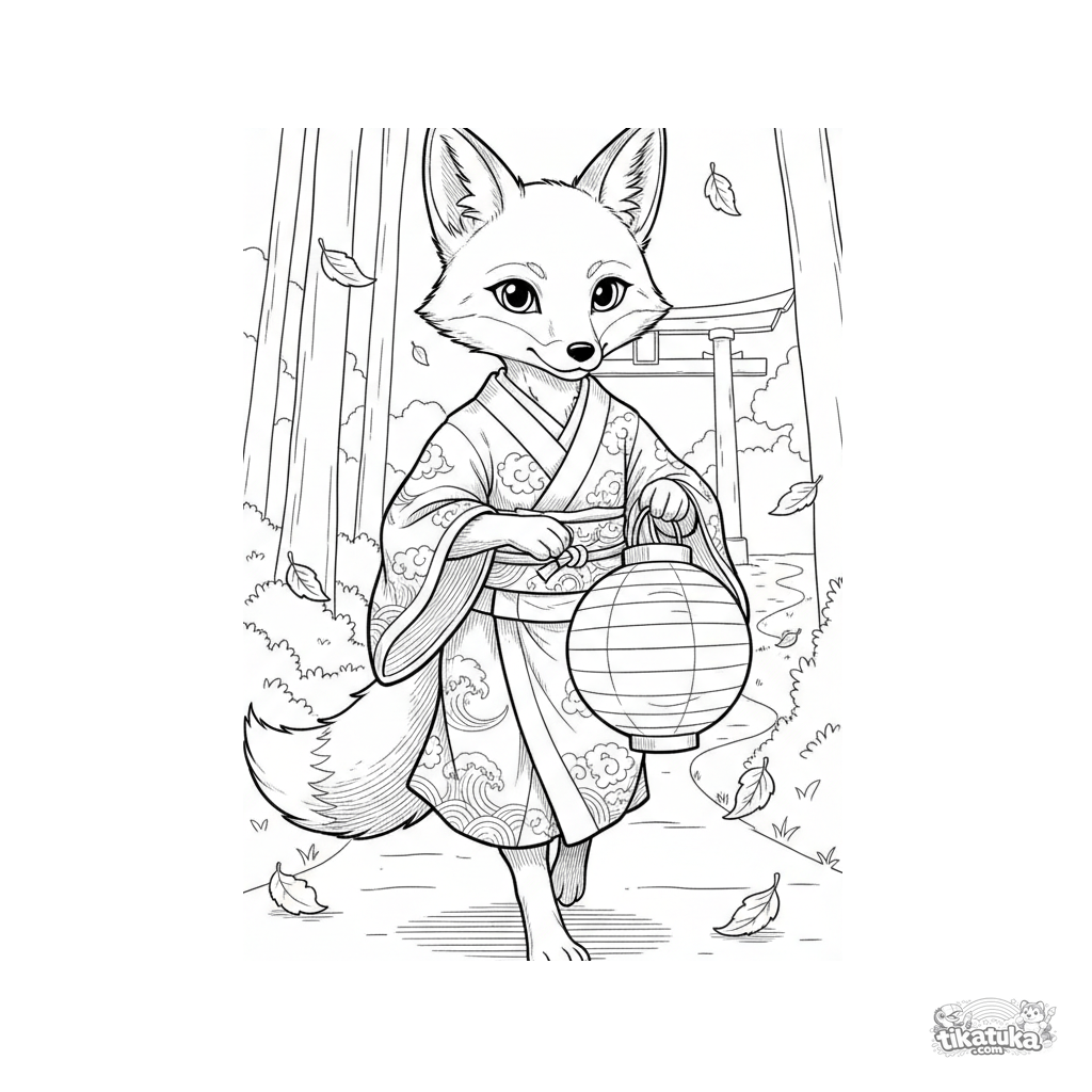 Kinder-Ausmalbild: ein junger Fuchsgeist in einem Gewand trägt eine Papierlaterne einen Waldweg entlang. Kostenlose druckbare Seite, geeignet für 4-6 Jahre.