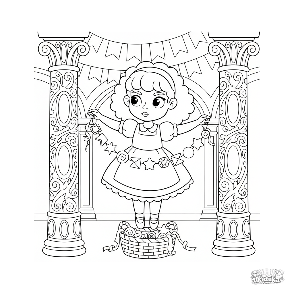 Ausmalbild für Kinder 4-6: Ein Mädchen schmückt eine Festhalle mit Papiergirlanden. Süße Szene der Partyvorbereitung.