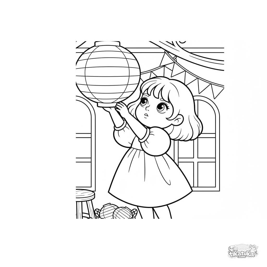 Ausmalbild für Kinder 4-6: Ein Mädchen dekoriert einen Festtagssaal mit riesigen Papierlaternen. Süße Vorbereitungsszene.