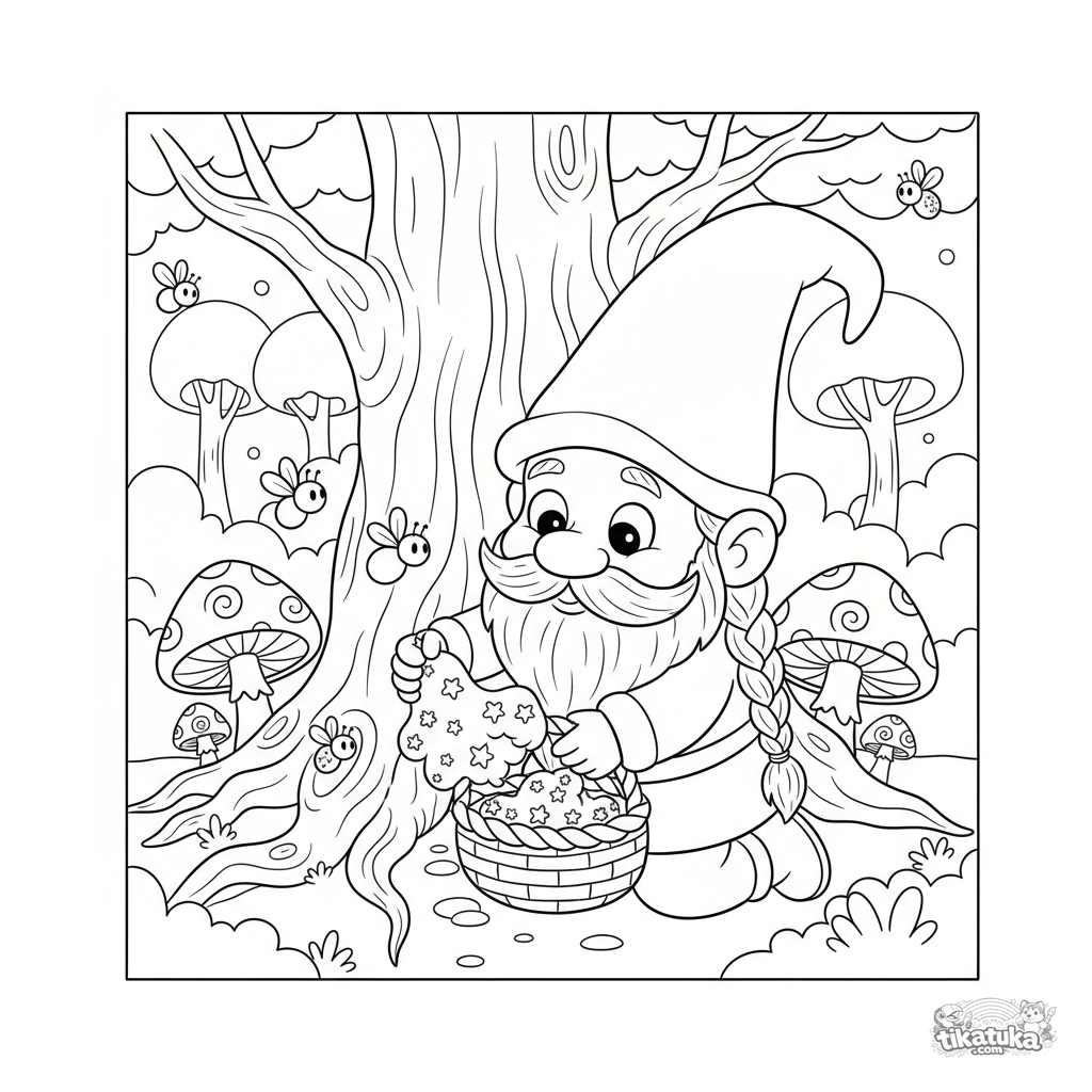 Ausmalbild für Kinder 4-6: Ein junger Gnom-Kräuterkundiger sammelt vorsichtig leuchtendes Mondmoos von den Wurzeln eines Riesenbaums in einem verzauberten Wald.