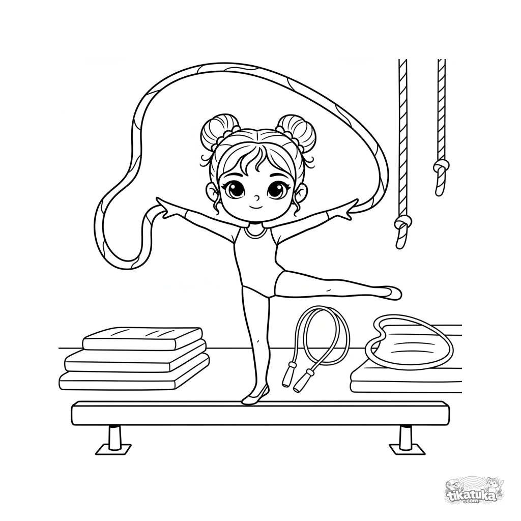 Ausmalbild für Kinder: Eine Turnerin auf dem Schwebebalken mit einem Band in der Turnhalle. Für 4-6 Jahre.