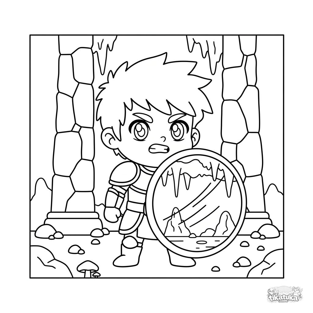 Ausmalbild für Kinder 4-6: ein junger Held mit einem Spiegelschild in der gefährlichen Höhle der Medusa der Gorgone. Dynamische Pose im Comic-Stil, klare Umrisse.