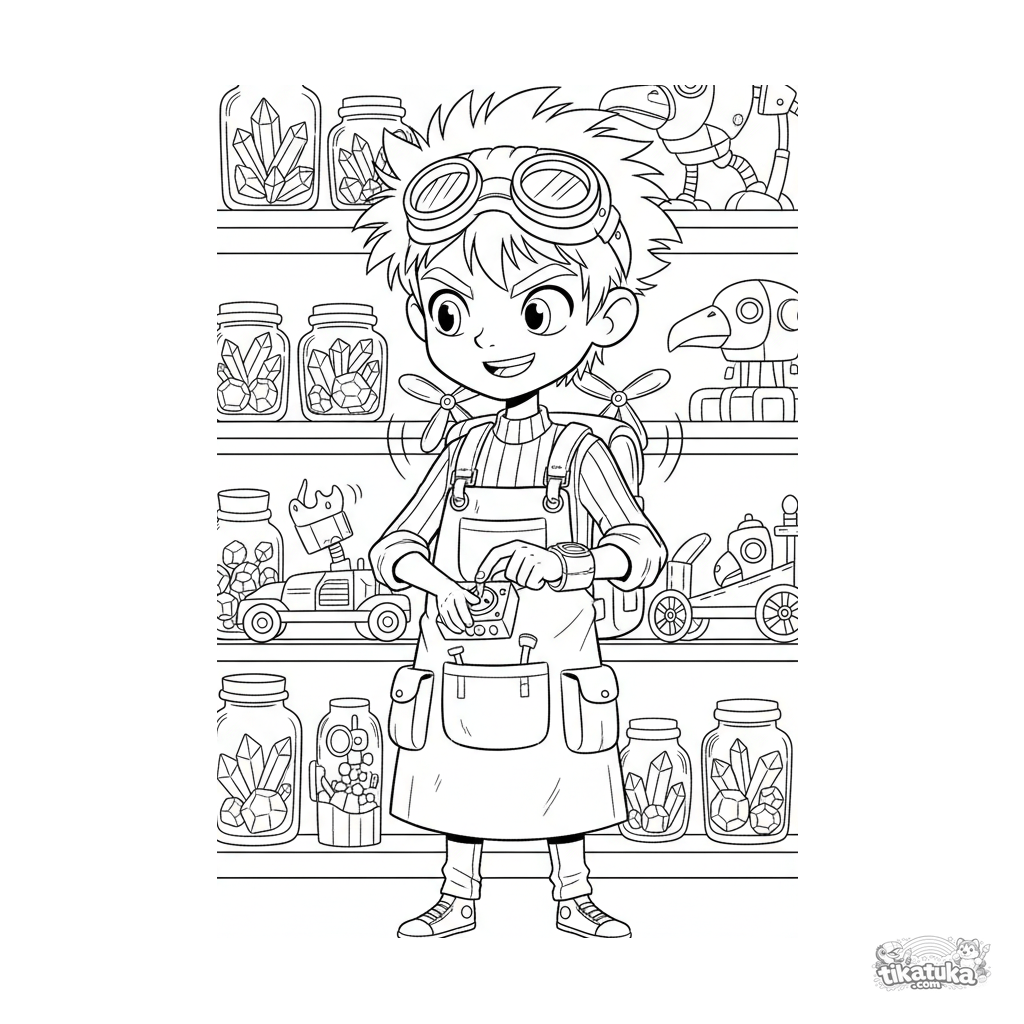 Ausmalbild für Kinder 7-9: Ein junger Erfinder testet im Geheimlabor seine Flugbrille und seinen mechanischen Rucksack.