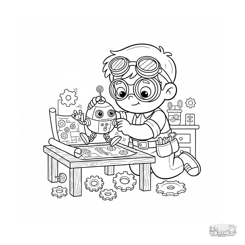 Ausmalbild für Kinder 4-6: ein junger Erfinder und sein hüpfender Roboter in einem geheimen Labor voller Blaupausen und Zahnräder.