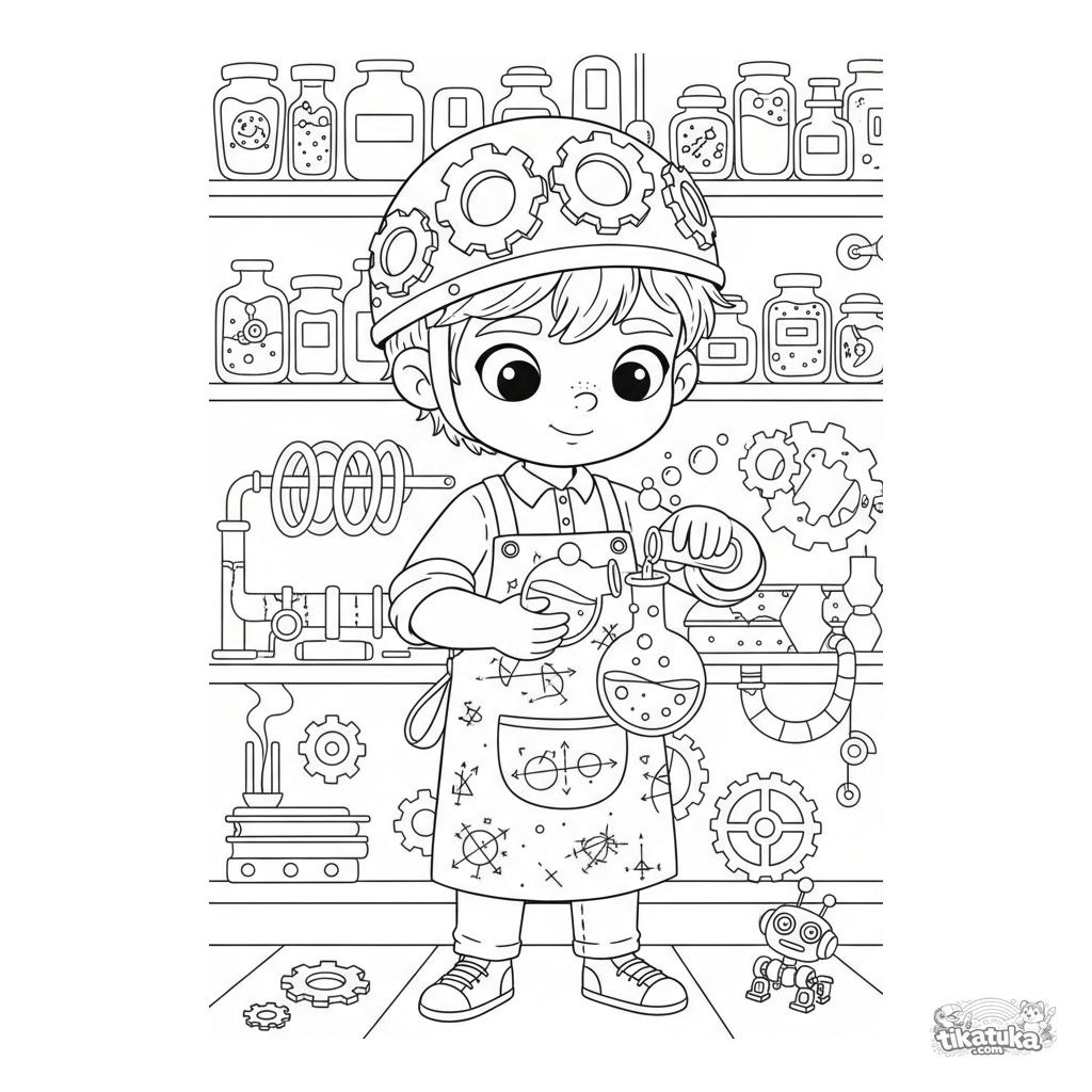 Ausmalbild für Kinder 7-9: Ein junger Erfinder im Geheimlabor führt ein Experiment mit blubberndem Trank durch. Zahnradhelm, Lederschürze, Regale mit Kolben.