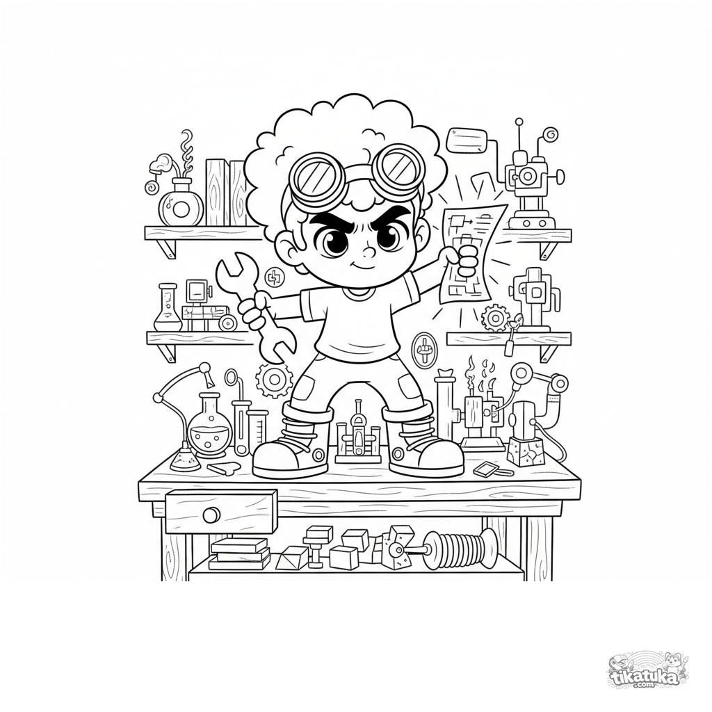 Ausmalbild für Kinder 7-9: Ein junger Erfinder testet seine Sprungstiefel in einem geheimen Labor voller Gadgets und Blaupausen.