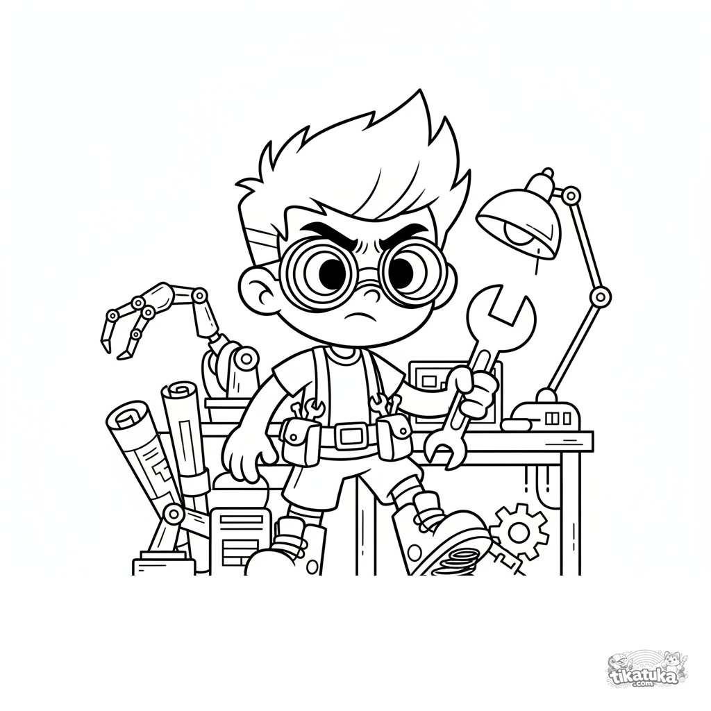 Ausmalbild für Jungen 7-9: Ein junger Erfinder testet Sprungstiefel in einem geheimen Labor voller Blaupausen und mechanischer Gadgets.