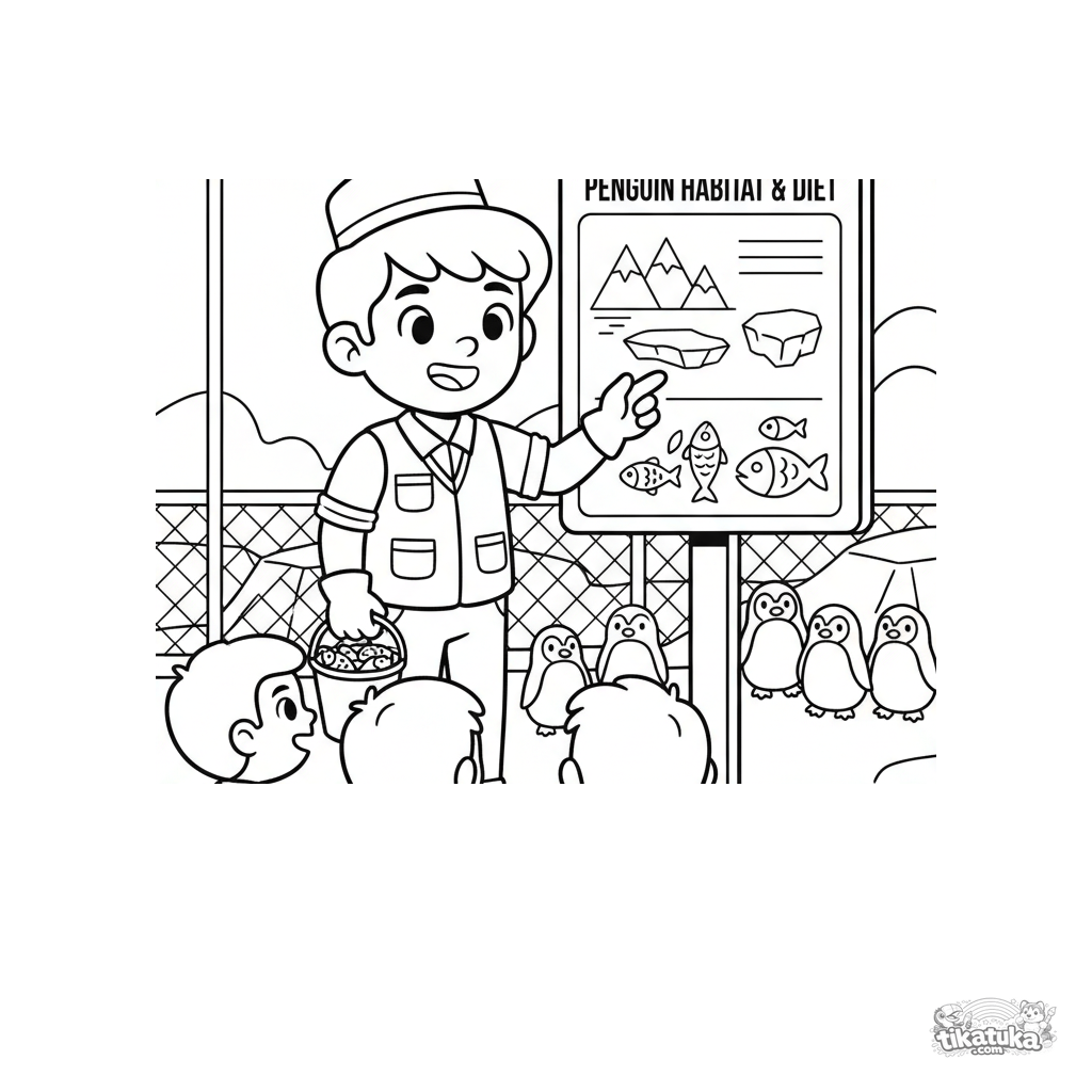 Ausmalbild für Kinder 4-6: Ein junger Zoo-Pfleger erklärt den Pinguin-Lebensraum an einem großen Informationsschild. Lehrreiche Szene zum Lernen über Tiere.
