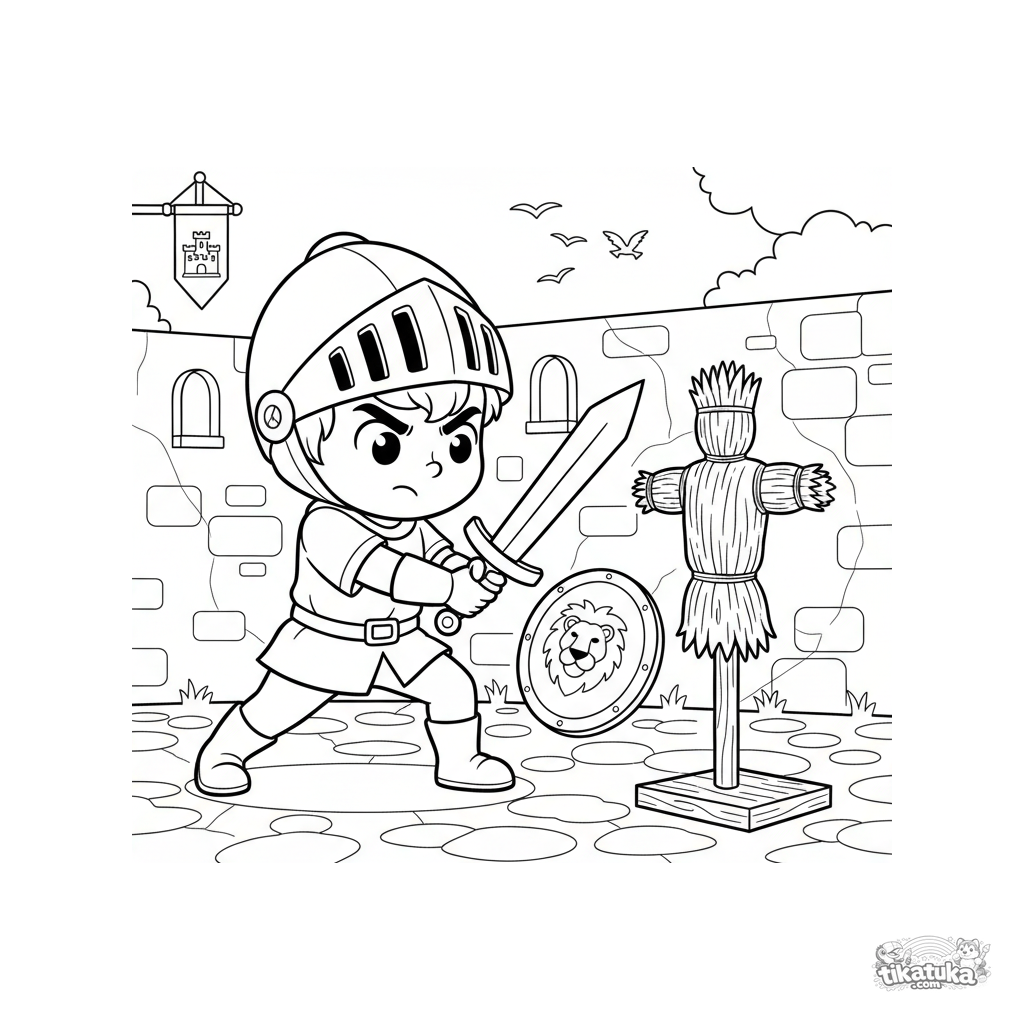 Ausmalbild für Jungen 4-6: Ein junger Ritter mit großem Helm übt mit einem Holzschwert und stürmt auf eine Strohpuppe im Schlosshof zu. Action-Szene.