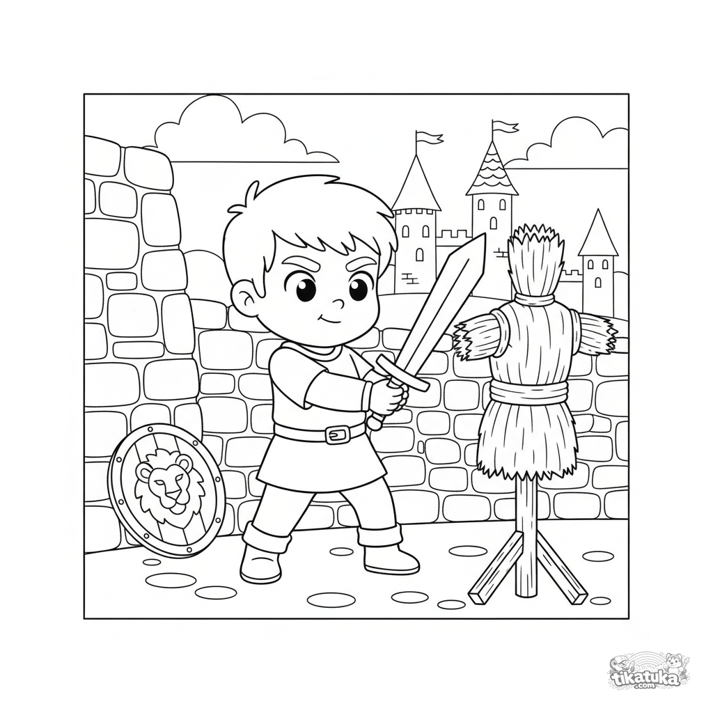Ausmalbild für Jungen 4-6: Ein junger Ritter übt mit einem Holzschwert an einer Strohpuppe auf einem Burghof. Eine dynamische Szene mit klaren Details.