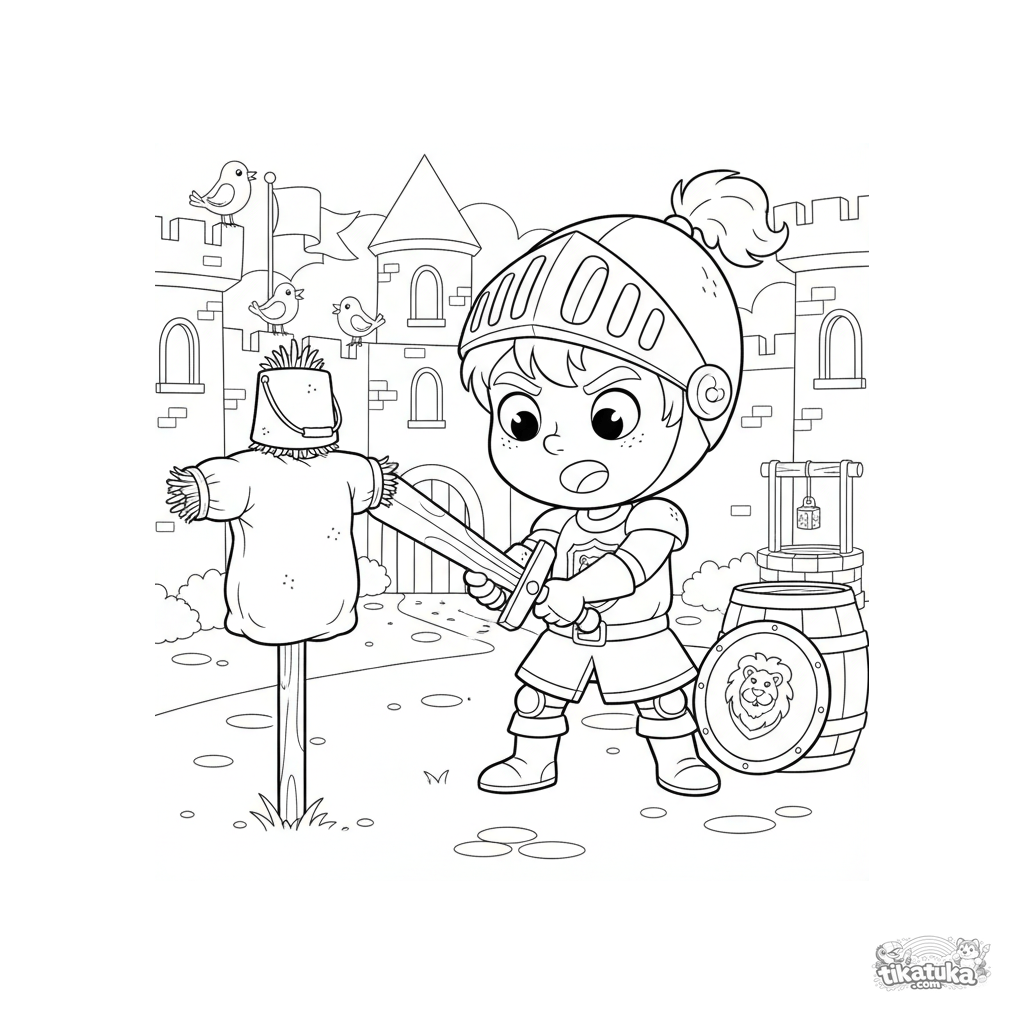 Ausmalbild für Jungen 4-6: Ein junger Ritter trainiert fleißig mit einem Holzschwert im Burghof. Dynamische Szene.