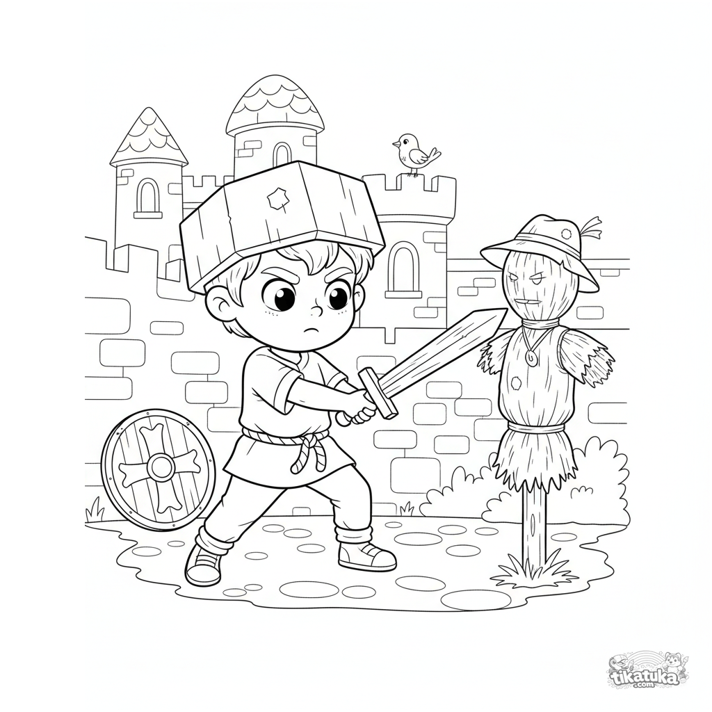 Ausmalbild für Jungen von 4 bis 6 Jahren. Ein junger Ritter mit einem Papphelm übt mit einem Holzschwert an einer Strohpuppe auf einem Burghof. Eine actionreiche Szene.