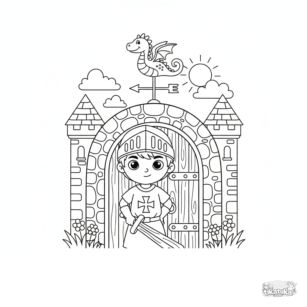 Ausmalbild für Jungen 4-6: Ein junger Ritter mit Holzschwert steht Wache am Burgtor. Eine dynamische Szene zum Ausmalen.