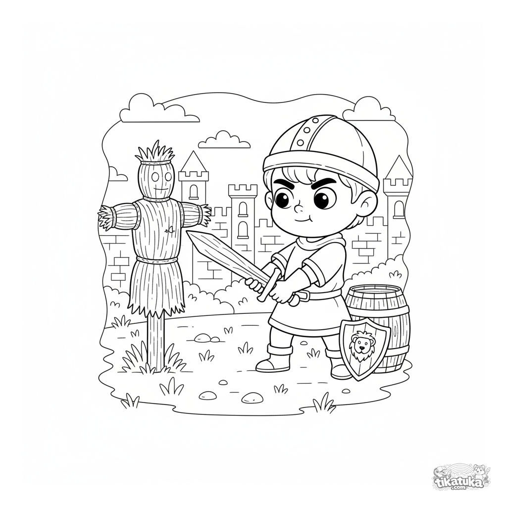 Ausmalbild eines jungen Ritters, der mit einem Holzschwert im Burghof trainiert. Für Jungen von 4 bis 6 Jahren.