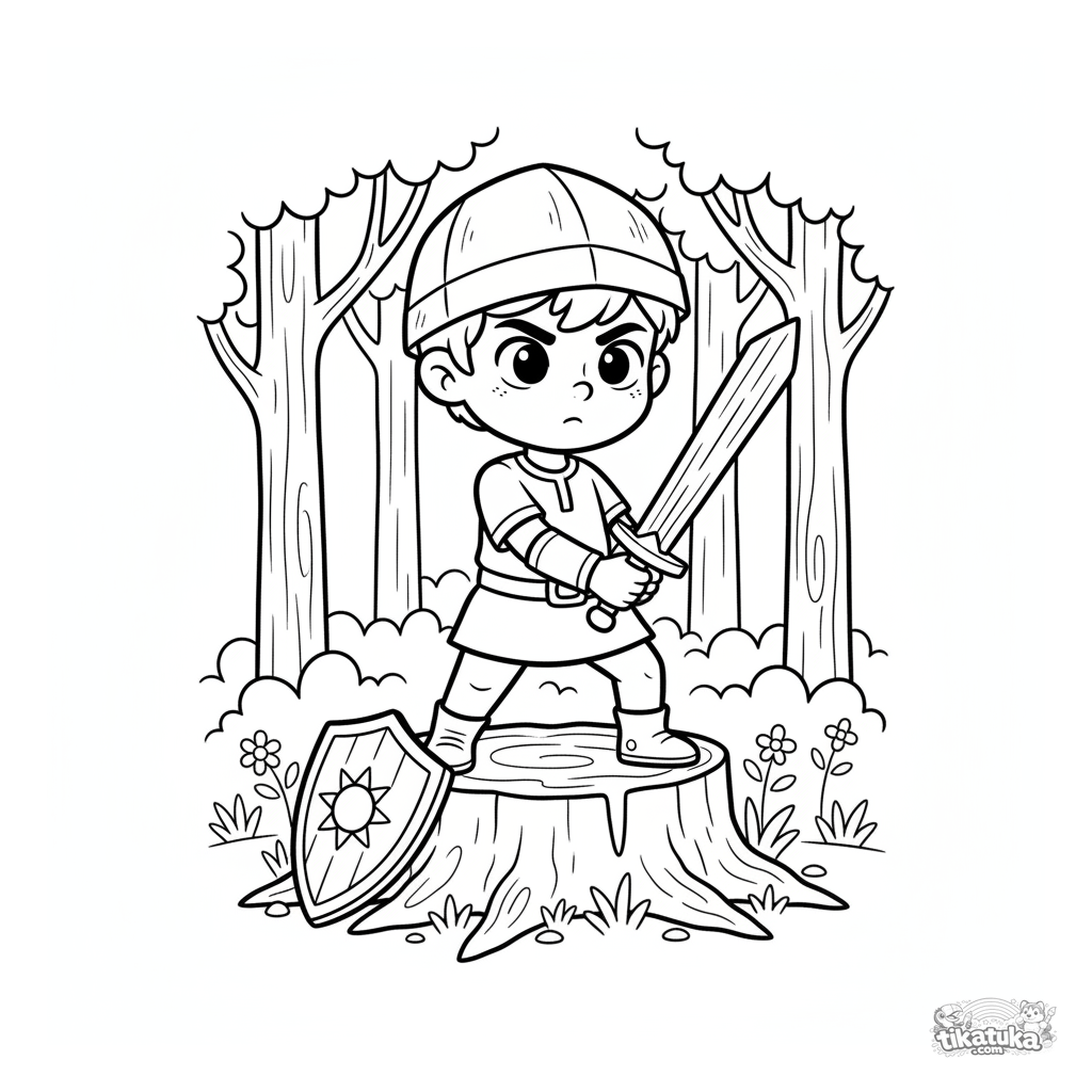 Ausmalbild für Jungen 4-6: Ein junger Ritter übt mit einem Holzschwert auf einem Baumstumpf im Wald. Eine aktive und einfache Szene.
