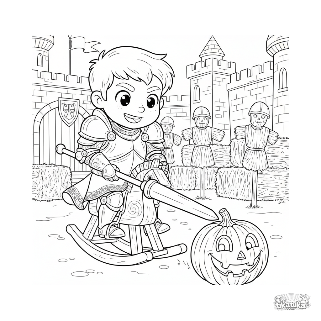 Lustiges Ausmalbild eines jungen Ritters auf einem Schaukelpferd, der gegen einen rollenden Kürbis trainiert. Für Kinder von 6-9 Jahren.