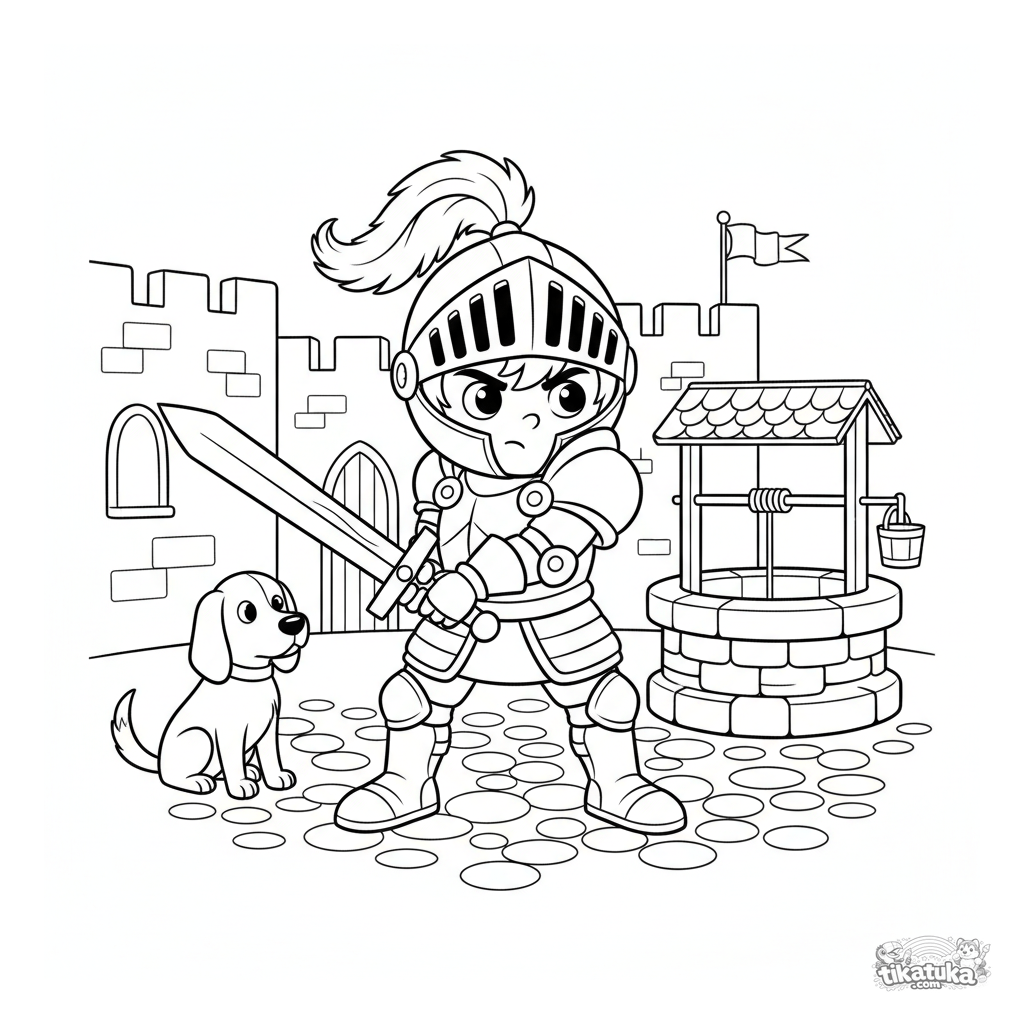 Ein Ausmalbild für Jungen: ein junger Ritter in Rüstung übt mit einem Holzschwert auf einem Schlosshof. Klare Umrisse und lustige Details für Kinder von 4-6 Jahren.