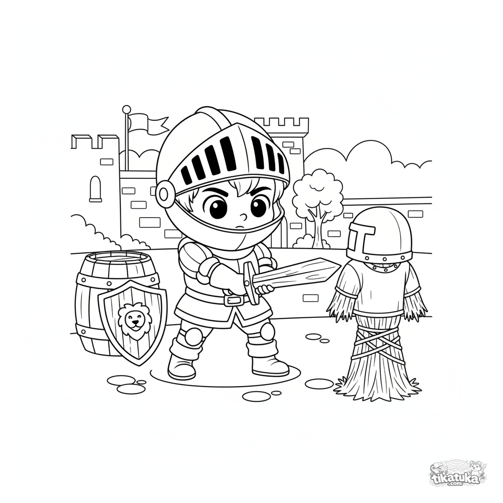 Ausmalbild eines jungen Ritters, der mit einem Holzschwert im Schlosshof trainiert. Für Jungen von 4-6 Jahren. Er trägt eine Rüstung und übt an einer Strohpuppe.
