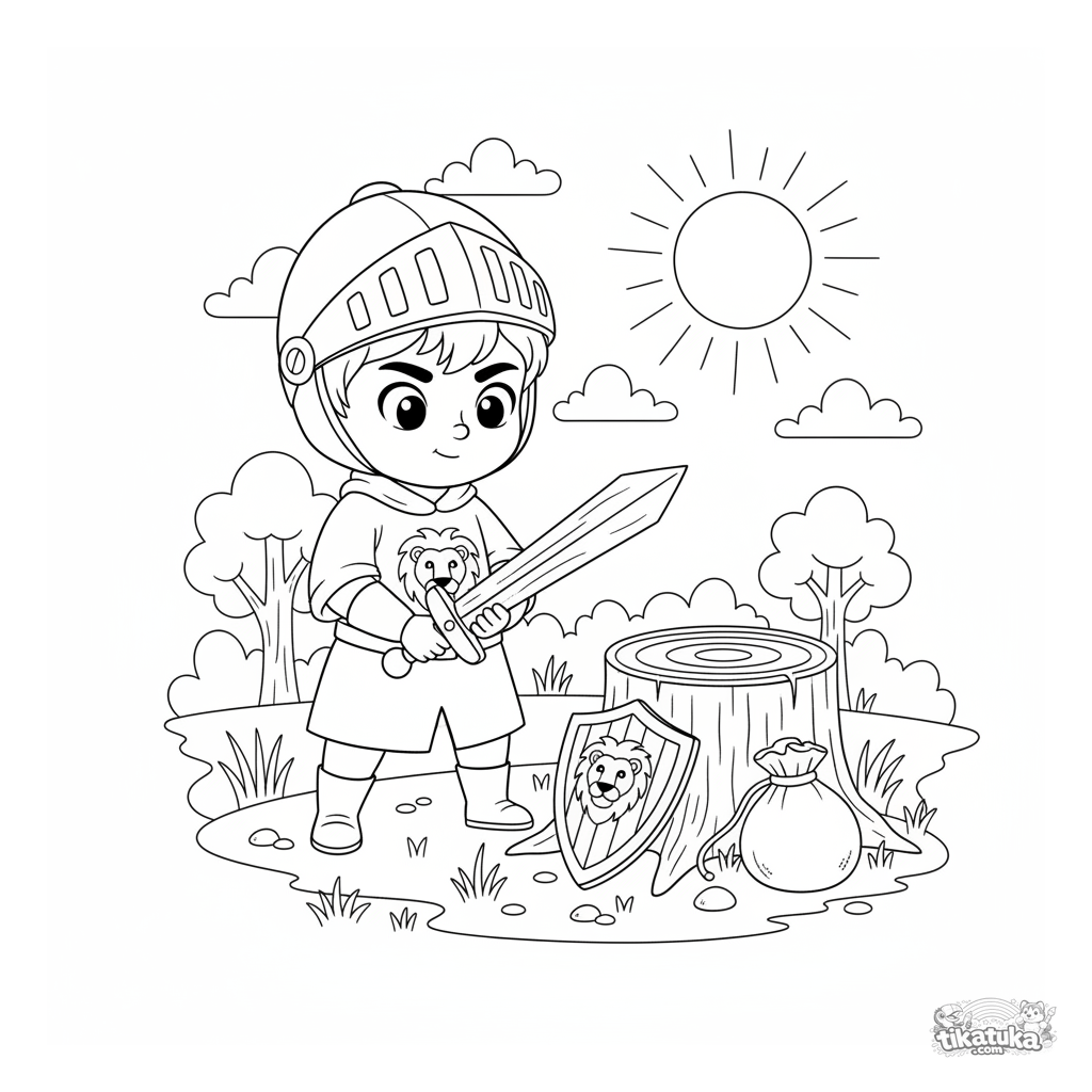 Ausmalbild eines jungen Ritters, der mit einem Holzschwert an einem Baumstumpf trainiert. Für Jungen von 5 bis 8 Jahren.