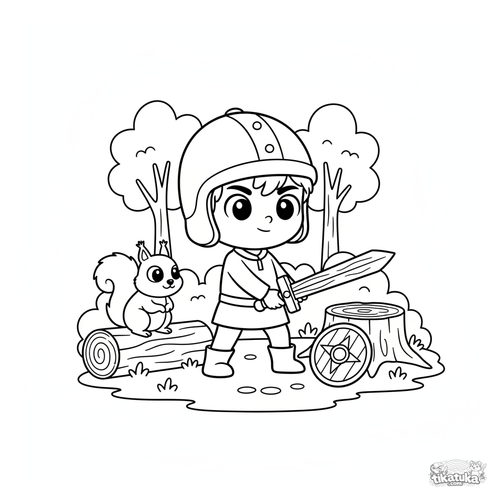 Ausmalbild für Jungen: Ein junger Ritter trainiert mit einem Holzschwert auf einer Waldlichtung. Für Kleinkinder 2-5. Einfache, große Details.