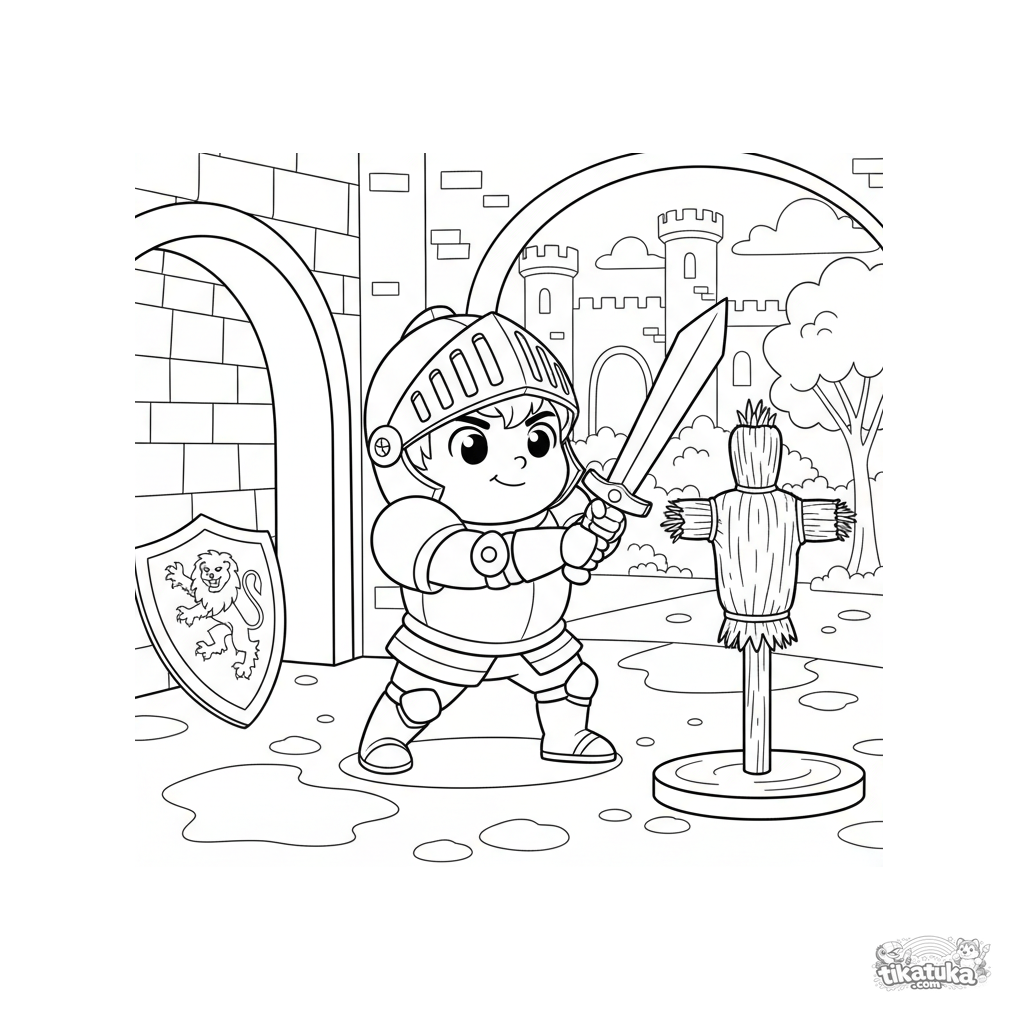 Ein Ausmalbild für Jungen mit einem jungen Ritter, der mit einem Schwert auf einem Strohmann trainiert. Für Kinder von 4-6 Jahren.