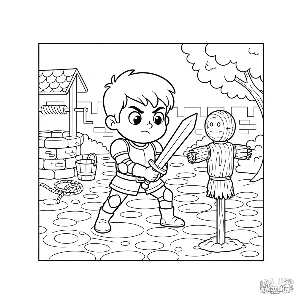 Ausmalbild für Jungen: Ein junger Ritter trainiert mit einem Holzschwert gegen eine Strohpuppe im Schlosshof. Für Kinder von 5 bis 8 Jahren.